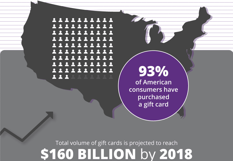 “93% of American consumers have purchased a Gift Card” and “the total volume of Gift Cards is projected to reach $160 billion by the end of 2018,” reports Gift Card Granny.