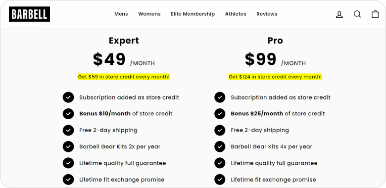 Let’s see how tiered memberships work in the wild. The athletic apparel brand Barbell has two membership levels that appeal to their most loyal customers: Expert and Pro. Experts pay $49 per month for membership and receive $59 in monthly store credit, two gear kits per year, as well as other perks. Pros pay $99 per month and get $124 back in store credit and four gear kits per year, in addition to the benefits Experts receive.