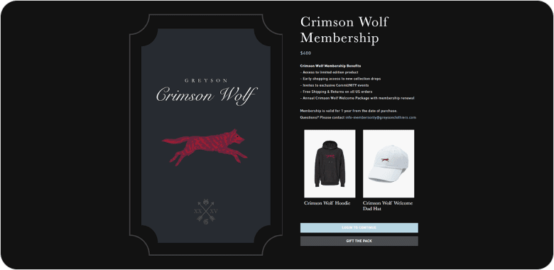 The golf and lifestyle apparel brand Greyson gives members of its Pack exclusive access to members-only products and first access to new collection drops. For example, Crimson Wolf members receive an exclusive Crimson Wolf hoodie and hat, while Black Wolf members receive a Black Wolf hoodie, tee, and hat. All membership tiers also come with exclusive event invites.