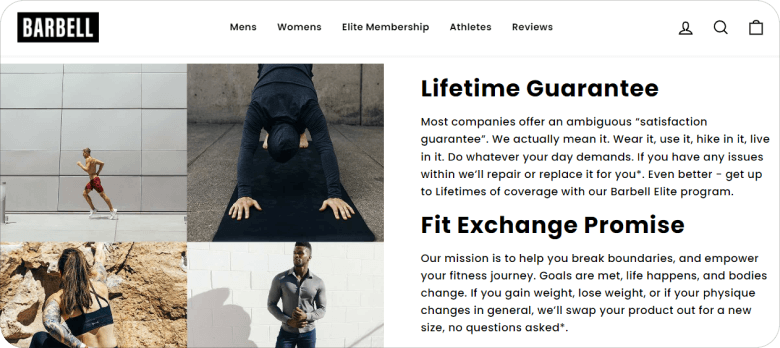 Circling back to Barbell, the team goes beyond free shipping to give members a lifetime guarantee and fit exchange promise. The lifetime guarantee gives customers free repairs or replacements of items for as long as they’re paid members. With fit exchange, members can swap products for new sizes as their bodies change. Those are some truly useful perks for a brand that’s all about putting the “fit” in “fitness.”