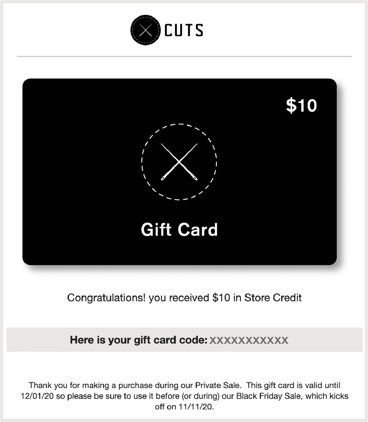 LA-based Premium men’s shirts store, Cuts Clothing, tackled this problem by using the extra traffic that the store’s big sale brought, to increase brand loyalty and RPR. They also offered limited-time store credit rewards during October 2020 which expired at the end of the same year. This encouraged their customers to use the credits during the Black Friday sale. With a 14.10% redemption rate and a $237K revenue, it is clear to say that this was a successful campaign.