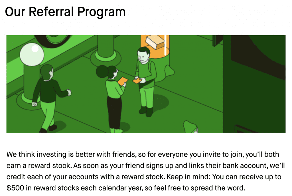 When customers refer friends, they each get a stock for free. Customers can receive up to $500 worth of stocks for referrals in each calendar year.