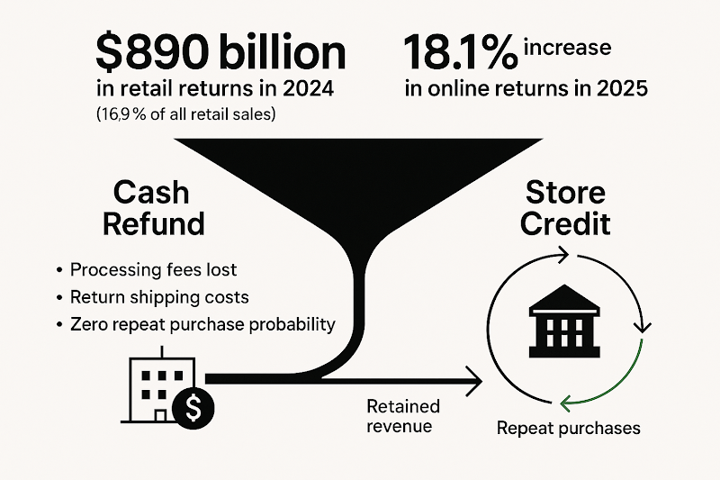 The NRF and Happy Returns report found $890 billion in merchandise was returned in 2024 alone - 16.9% of all retail sales. Chain Store Age reports global online return volumes jumped 18.1% in 2025. Every cash refund you issue doesn't just reverse a sale - it pulls working capital out of your business while you still absorb the shipping, processing, and restocking costs.